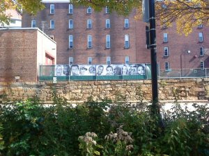 As a volunteer with the Manchester Arts Commission, I was able to participate in the installation of the Inside Out Project around the mill area of Manchester. The Commission assembled and printed 200 portraits of Manchester residents, negotiated with property owners, and sent out teams armed with paste to install pictures near Channel 9, the Mill Girl, near the Red Arrow Diner, and inside of empty and occupied business locations along Elm Street in preparation of TEDx AmoskeagMillyard. Some survived from date of installation to the date of the event, some peeled off immediately due to the frying heat of the Autumn sun. Some got pulled down. If you visit InsideOutProject, you can search photos from communities around the world that participated in this happening.