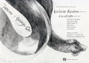 Joining Valerie is Clara Engle, a soloist whose “voice comes… from that deepest of all places, imaginative space, from which she visually retrieves an inner landscape converted by breath into the rock equivalent of poetry. Rarely has a voice sounded so authoritative, so unapologetic in its disclosures, so sure of its direction in going home into song.” (Jeremy Reed).